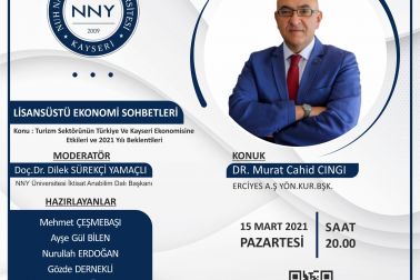 15 Mart 2021 Pazartesi Günü Saat: 20:00'de “Lisansüstü sohbetler” adlı programda Kayseri Büyükşehir Belediyesine bağlı Kayseri Erciyes A.Ş. Yönetim Kurulu Başkanı ve Genel Müdür Dr. Murat Cahid CINGI konuğumuz oldu. İktisat Bölüm Başkanı Doç. Dr. Dilek S. YAMAÇLI Moderatörlüğünde gerçekleştirilen söyleşide "Turizm Sektörünün Türkiye ve Kayseri Ekonomisine etkileri ve 2021 Yılı Beklentileri" konusu ele alındı.